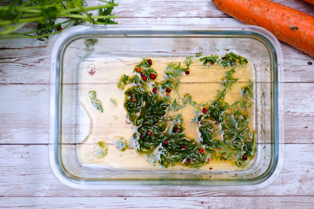 - Make the marinade. Chop the fresh dill and mix all ingredients in the bowl where you will put your carrots in.