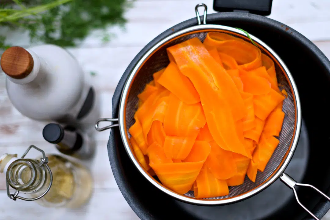 - Drain your carrots in a strainer. When the slices are soft, you can drain them. Usually, 4-5 minutes of boiling time is perfect. Let them cool down like this for some minutes.