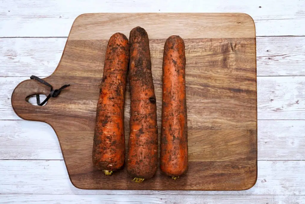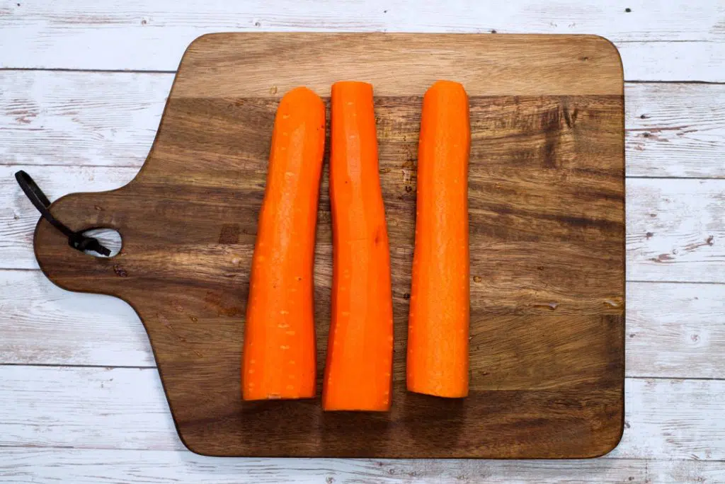 - Peel your 3 big carrots and wash them. Cut the ends.