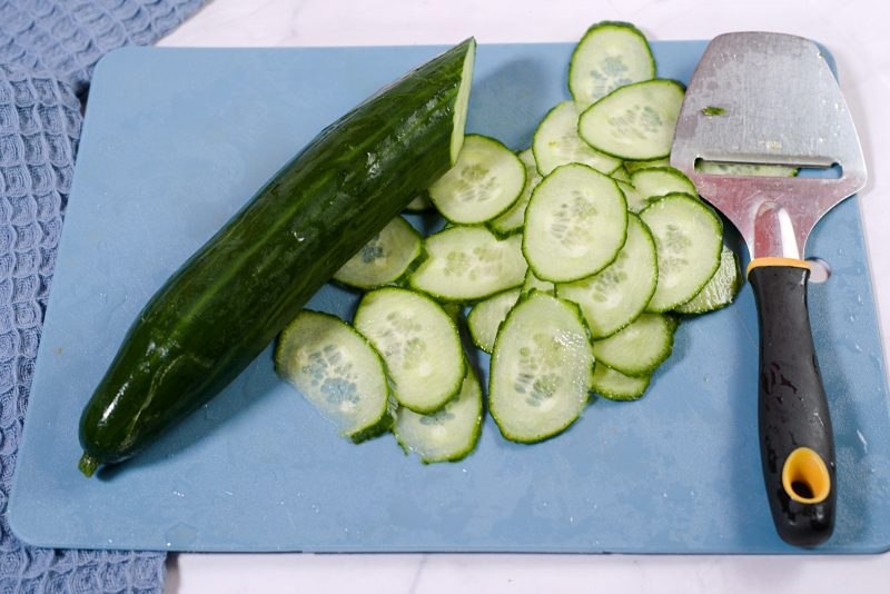 Chop the cucumber into pieces or slice it thinly with a cheese slicer.